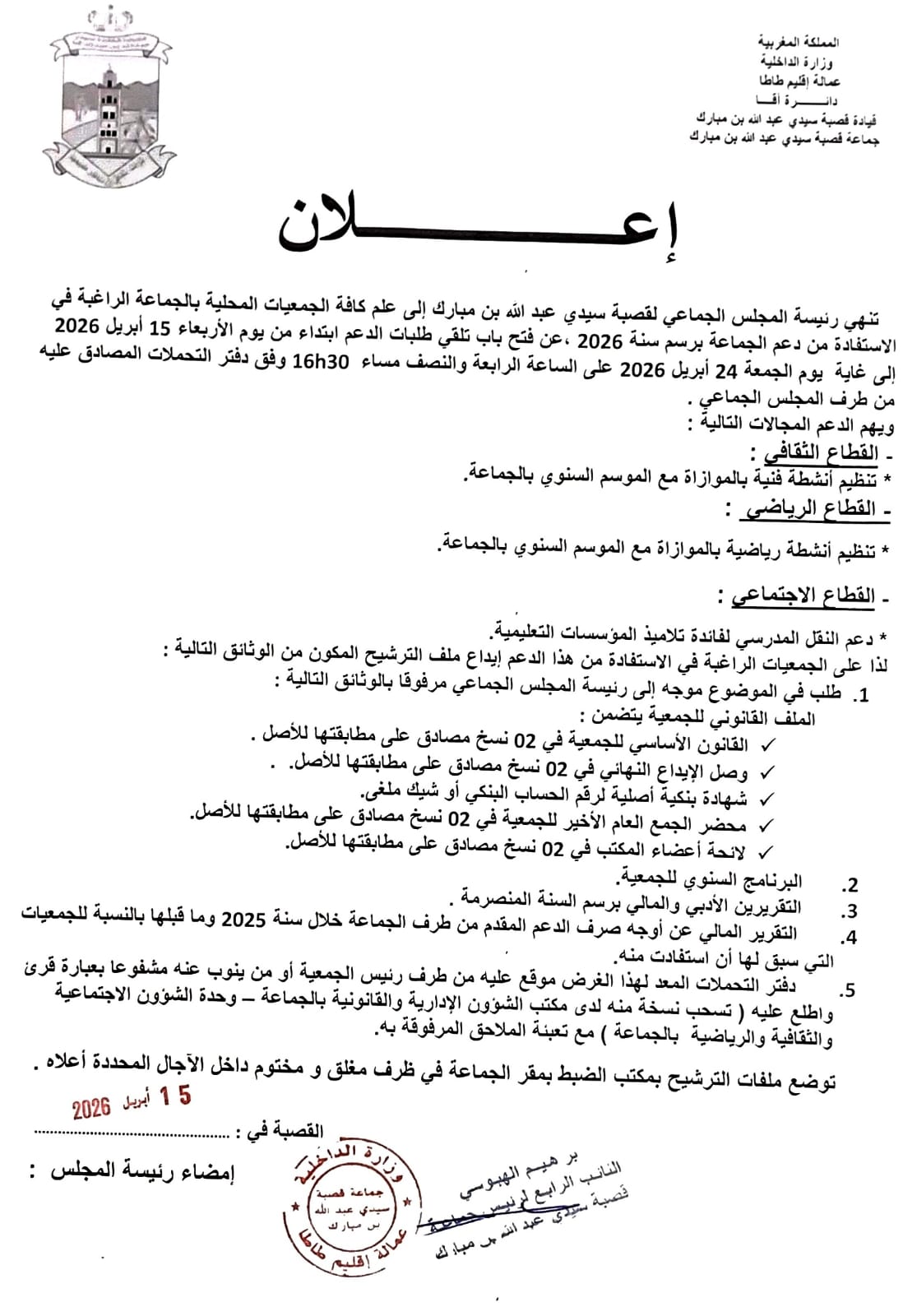 اعلان عن تلقي طلبات الدعم الموجه لفائدة الجمعيات المتواجدة بجماعة قصبة سيدي عبدالله بن مباركبرسم سنة 2026