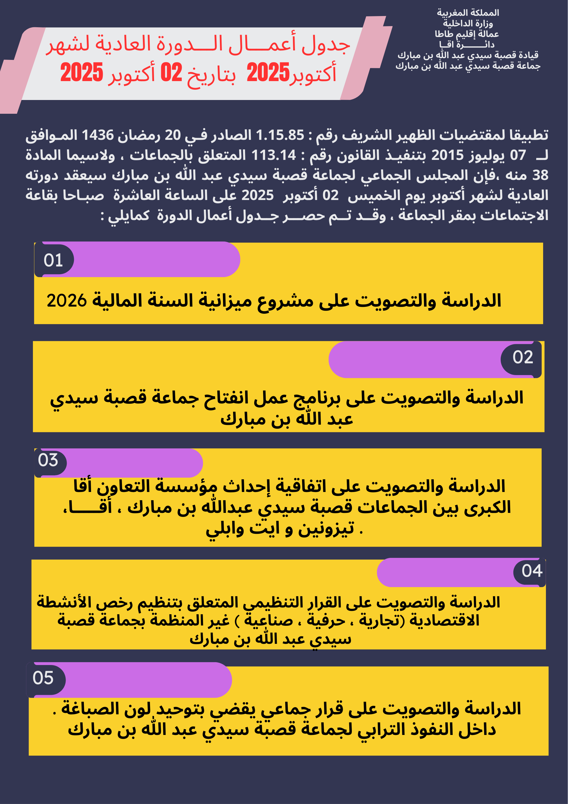 جدول اعمال الدورة العادية للمجلس الجماعي لقصبة سيدي عبدالله بن مبارك لشهر اكتوبر 2025